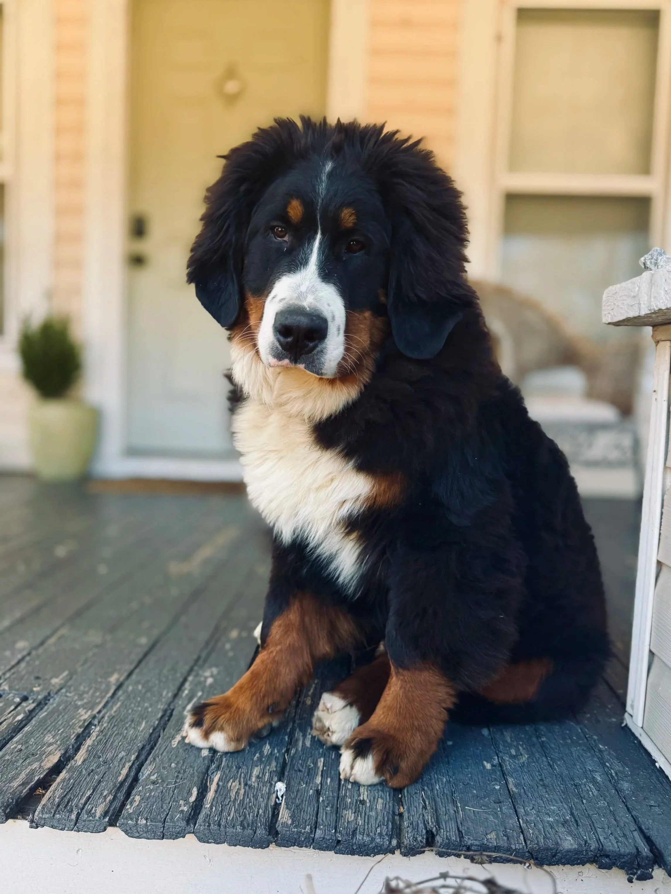 Fiona is not shy about her love of affection. She loves attention and pets from family and strangers alike. She is a great sidekick for lazy days at home and always down for a cuddle. Fiona is great at alerting when company comes, but always greets them with a tail wag and a head in their hand for scratches. She loves being a mom and does an exceptional job. Fiona weighs 75 pounds and is on the small side for the breed making her a slender lady, perfect for those wanting all the positives of Berner in a smaller package.